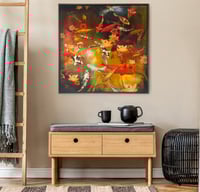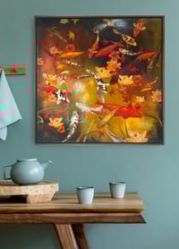 The colour palette is designed to be vibrant and bold without being garish. Lily has developed a unique way of working, using reproductions of her own painting and printmaking studies as collage material on a canvas. The koi fish are meticulously painted, reproduced, and cut, ready to use on the canvas. The background is painted with acrylics. The use of collage allows the freedom to play with the composition in a way which would otherwise be impossible, allowing quick changes until a design is settled upon. When the collage is fixed in place, washes of ink have been applied. Finally, a glossy varnish enhances colour, adds protection, and offers an opulent shine.