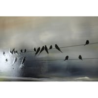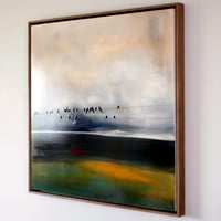 The Swallows gather on the line, ahead of the storm, heralding the change of the seasons, evoking feelings of chatter and activity before a great journey. This canvas is also a celebration of natural beauty, wide open skies, earthy colours.
