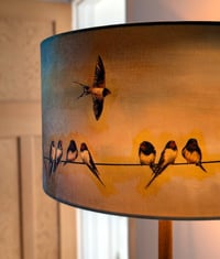 Drum lampshade featuring 'Swallows' design by Lily Greenwood. The gathering Swallows swoop and chatter as they prepare for a great journey ahead, a beautiful finishing touch to any room.