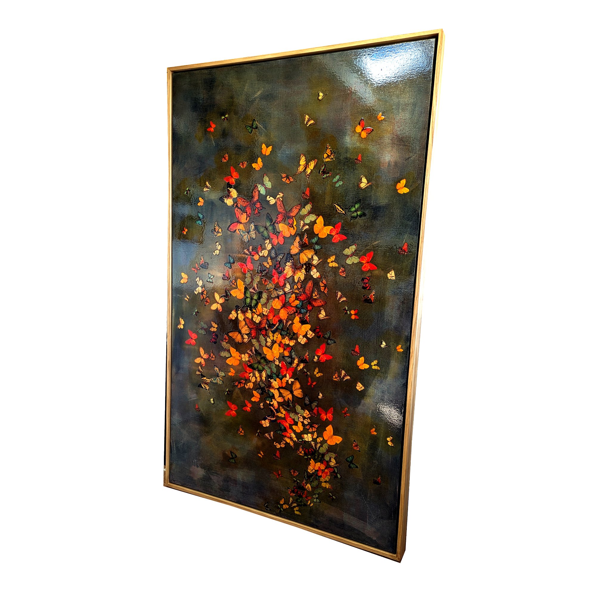 Lily has developed a unique way of working, using reproductions of her own paintings as collage material on a canvas. The butterflies are meticulously painted, reproduced, and cut, ready to use on the canvas. The background is painted with acrylics. The use of collage allows the freedom to play with the composition in a way which would otherwise be impossible, allowing quick changes until a design is settled upon. When the butterfly collage is fixed in place, washes of ink have been applied. Finally, a glossy varnish enhances colour, adds protection, and offers an opulent shine.