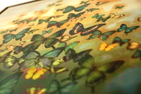 The upward burst of butterflies embodies energy, vitality, positivity, and joy. The butterflies are set to a background of Prussian blue, in a soft gradient from dark to pale. Lily aims for her colour palettes to be strong and vibrant without being garish. Lily has developed a unique way of working, using her own paintings as collage material on a canvas. Butterflies are meticulously painted, reproduced, and cut, ready to use on a canvas. The background is painted with acrylics. The use of collage allows the freedom to play with the composition in a way which would otherwise be impossible, allowing quick changes until a design is settled upon. When the butterflies are fixed in place, washes of ink have been applied. Finally, a glossy varnish enhances colour, adds protection, and offers an opulent shine.