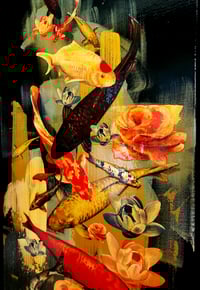 A delicate flow of beautiful Koi fish. In Japan, Koi fish are traditionally symbolic of prosperity and good fortune. Set to a background of black and gold, with pale blues and greens, and featuring details of leaves, lilies and florals. Ink washes and a varnish finish add texture and depth.