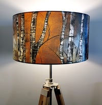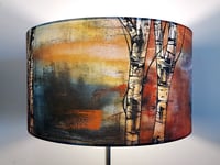 Drum lampshade featuring 'Silver Birch' design by Lily Greenwood. Featuring rich colours, a beautiful finishing touch to any room. All Lily's lampshade fabric designs are derived from her original paintings, and Lily constructs the lampshades by hand in her garden studio in the Cumbrian countryside.